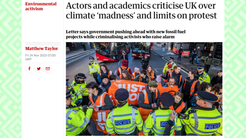The letter (which you can read in full here) and signed by more than 100 actors, authors, scientists and academics says the UK government is ignoring the scientific reality of the climate and ecological crisis, pushing ahead with new fossil fuel developments and criminalising peaceful protesters who raise the alarm.