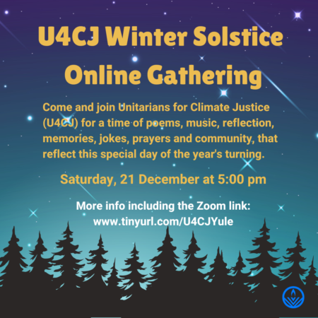 Join “Unitarians for Climate Justice” (U4CJ) for a Winter Solstice and Yule on-line Service and Gathering: 5:00 pm, Saturday 21st December.